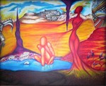 2005Door een fata morgana lijkt een woestijn opeens veel levendiger. Door een fata morgana kan alles lijken wat het niet is. In dit schilderij zitten veel van deze elementen.